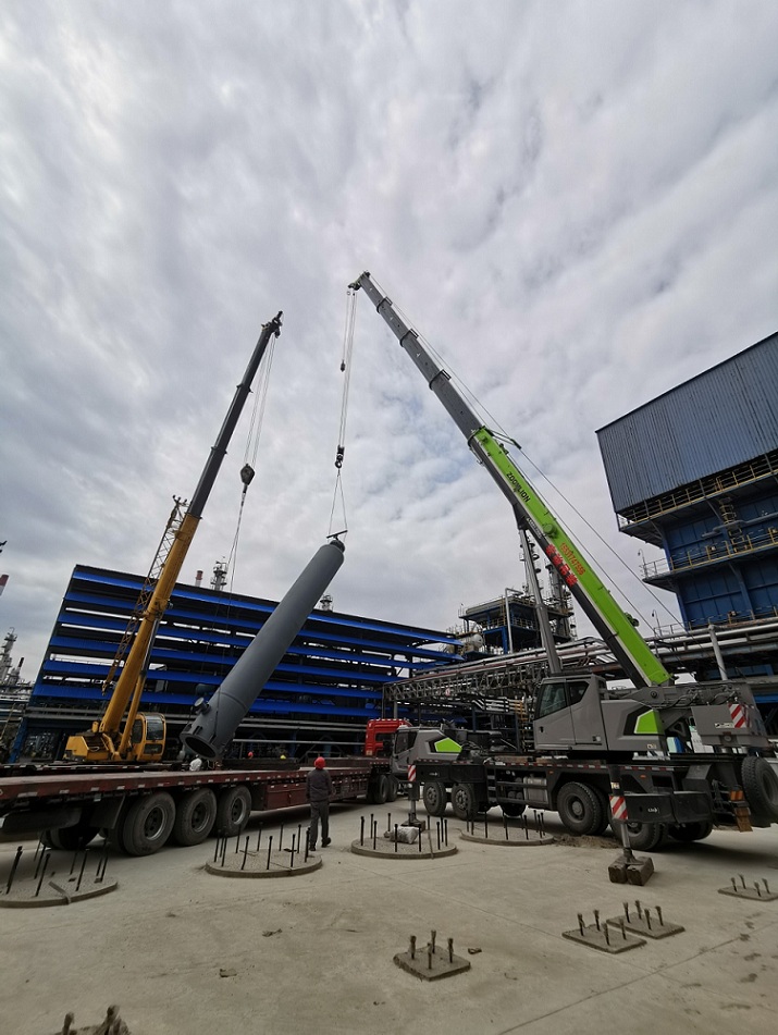 331日上午9時(shí),伴隨著指揮人員的一聲哨響,“吸附塔”在兩臺(tái)吊車(chē)的默契配合下平穩(wěn)起升,回轉(zhuǎn)、直立、就位一系列動(dòng)作嫻熟準(zhǔn)確,8臺(tái)“吸附塔”在2天內(nèi)相繼完成吊裝,順利完成了該項(xiàng)目建設(shè)的關(guān)鍵節(jié)點(diǎn)。此項(xiàng)目建成后可回收氫氣5500Nm3/h,為加氫裝置用氫提供保障。